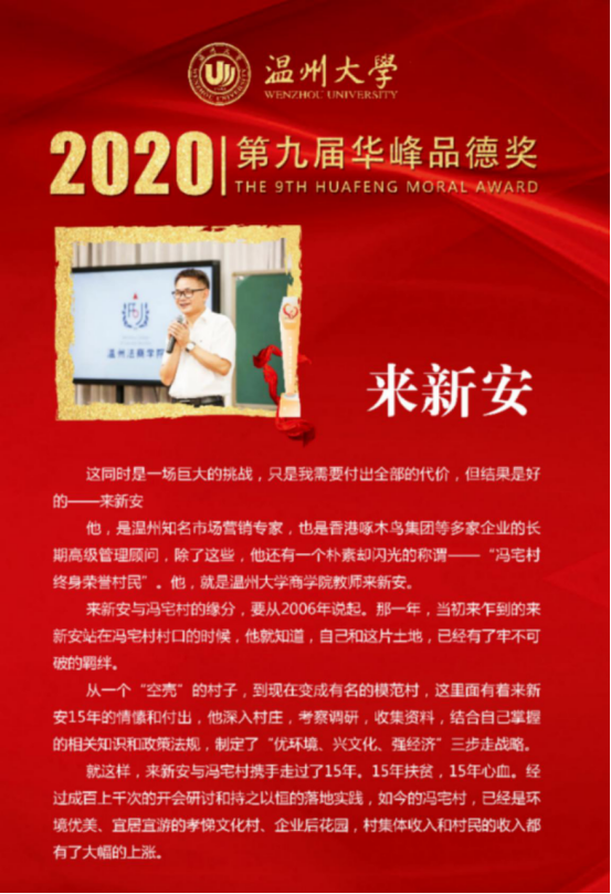 “你是温州大学专任教师,你也是冯宅村终生荣誉村民,巍巍师表,你育得桃李香满园,初心不改,你奏响了乡村高速发展的交响曲,建设社会主义新农村,你矢志不渝再出发”,这是组委会给来老师的颁奖词,这份沉甸甸的褒奖,在2020年这个决胜全面建成小康社会的关键年份,更显商院人的担当。