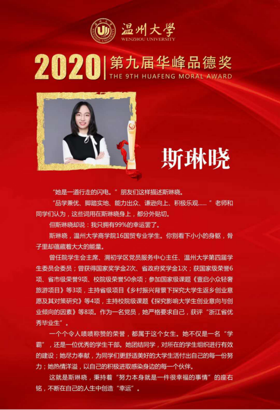 “优秀是你的习惯,阳光是你的气质,你把努力当幸福,你让创新成常态,你刻苦钻研,锐意进取,关爱他人,反哺社会,你是追梦路上耀眼的星光,更是莘莘学子学习的榜样”,这是组委会给斯琳晓同学的颁奖词,商院青年,不负青春,不负韶华!