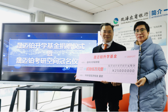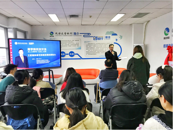 校友会副会长、温州晟迈铂贸易有限公司董事长莫欣慷慨捐资二十五万元在学院设立晟迈铂升学基金,并冠名晟迈铂考研空间。随后,他为学院各学生组织的优秀学生干部做《工匠精神是可持续发展的原动力》的精彩分享。