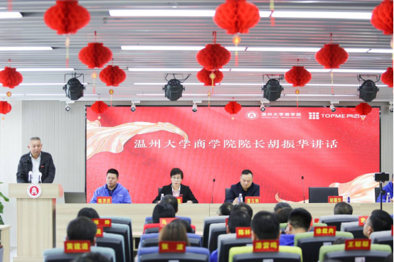 院长胡振华发表讲话,他指出,本次直播间的建成为学院增添了一个非常好的教学研究平台。直播间启用后,学院将发挥基地优势,利用喜闻乐见的方式,开展商务营销实训,本科生、研究生、留学生以及非学历生的招生宣传及其他商道思政活动等尝试,使之辐射到学院所有专业,成为校地合作的良好展示平台。