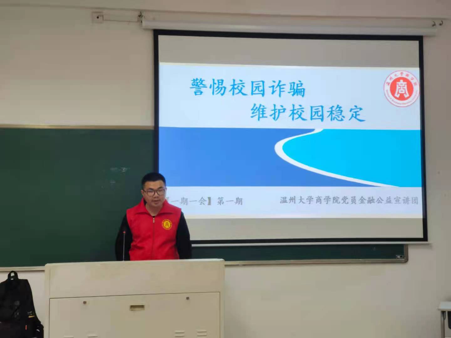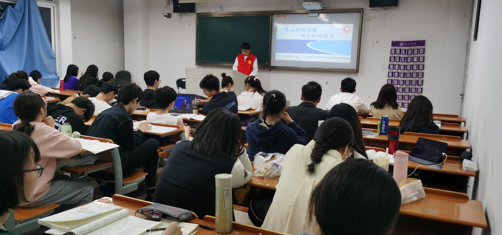 党员金融宣讲团为了认真贯彻落实习近平总书记的重要批示精神,结合学院已有的学科专业特色,以“一期一会”的方式,通过师生党员进班级、进寝室、直播等线上线下相结合的形式开展金融公益宣讲,为学院师生办实事,解难题,以此帮助更多同学获得校园反诈相关知识,提升同学们的反诈防骗意识和能力,维护校园和谐稳定,喜迎建党百年。第一期的宣讲主题是“警惕校园诈骗 维护校园稳定”。线下,宣讲团成员们主要通过进班级给低年级学生宣讲;线上,宣讲团成员们主要通过学院715思政直播间给校外实习生、研究生进行宣讲,实现学院班级、学生全覆盖。