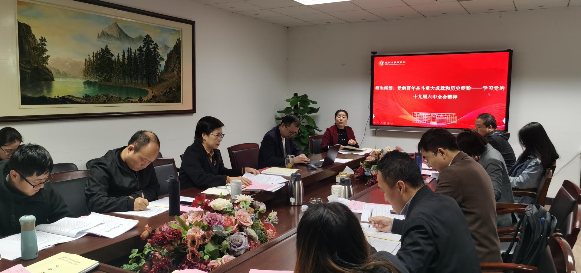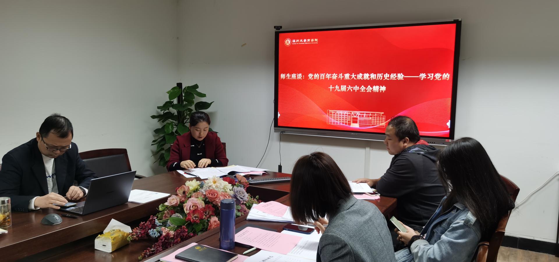 随后,与会师生畅谈感想。胡振华院长从政治经济学的角度解读十九届六中全会精神,并指出我们党在一百年历史进程中分别制定了三个《决议》,分别是1945年制定的《关于若干历史问题的决议》,1981年制定的《关于建国以来党的若干历史问题的决议》,今年制定的《中共中央关于党的百年奋斗重大成就和历史经验的决议》,这三个决议对于我们党的建设和发展具有重要意义。余向前副院长表示,中国共产党经历了一百年的风风雨雨,最优秀的品质就是善于学习和总结,并能够带领全国人民实现共同富裕。陈翊老师从自身出发讲到,“好好学习,天天向上”并不是一句口号,学就是为了做,要把所学做到日常的教学和学生工作中去,要在留学生教育和管理中推广、融入我们党的光辉历史和优良传统。方嘉奇老师结合自身在香港求学的经历对“全过程民主”谈了自己的看法,他认为我们认可的“全过程民主”并非个人民主,而是大多数人认可的民主,是人类的民主;也不是某一时刻的民主,而是提出问题到解决问题的全过程的民主。