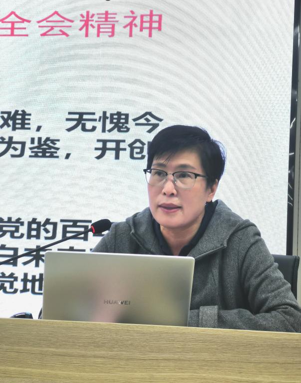 在A226仲辉商道讲堂举行全体教职工理论学习大会,深入学习贯彻党的十九届六中全会精神,学院党委书记郑彩莲领学。
