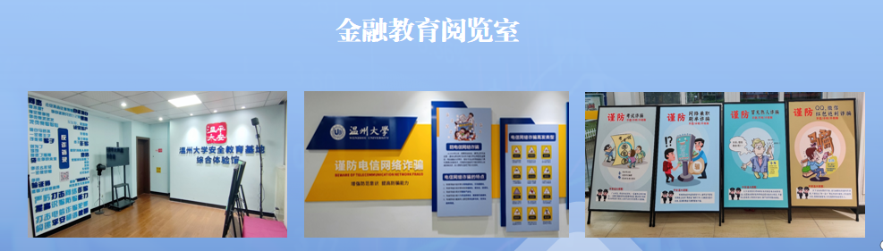 与招商银行温州分行合作创办。基地位于温州大学,合计区域面积150余平方,设有宣传阅览室、会议室、金融教育文化长廊和金融教育直播基地。其中,宣传阅览室设在温州大学安全教育基地内,并配有金融宣传教育读物、专栏、展架、折页等20余种材料,宣传阅览室全年工作日开放,一次性可接纳50余人;会议室、金融教育文化长廊设在温州大学彩票平台