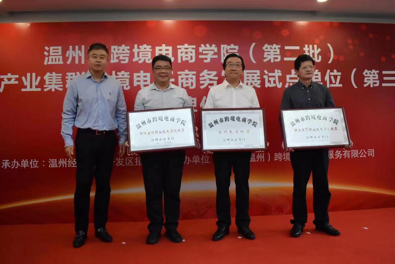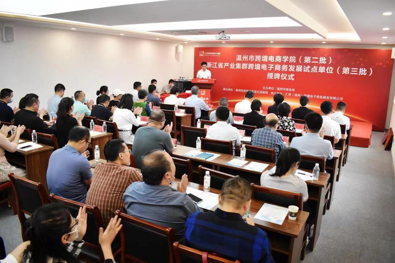 仪式上,为乐清市电器、苍南县针织内衣、龙港市礼品、经开区五金卫浴等获批浙江省第三批产业集群跨境电商发展试点单位及入选第二批温州市跨境电彩票平台