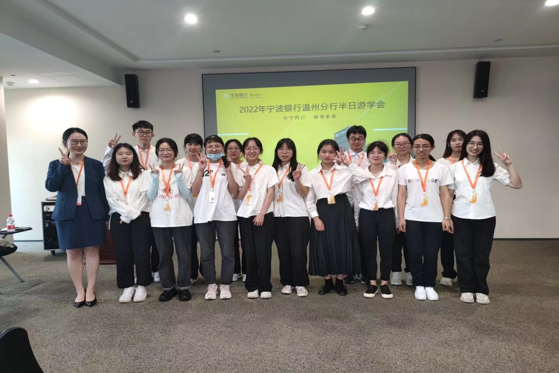 19财务管理2班共15位学生在大学生职业生涯规划与就业指导课任课老师唐华的带领下来到宁波银行温州分行进行为期半天的职业体验。本次体验活动旨在通过“小体验”去触发自己的“大未来”,让大家近距离了解银行的业务和感受银行的整体氛围。