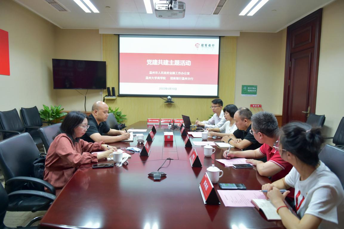 为丰富党建工作内涵,创新党建工作模式,推动基层党建实现“互联共建、互助共赢”,助推平安金融建设,2022年6月10日上午,唐华副书记带队赴招行温州分行与市金融办第三党支部、招商银行温州分行办公室党支部开展党建共建活动。