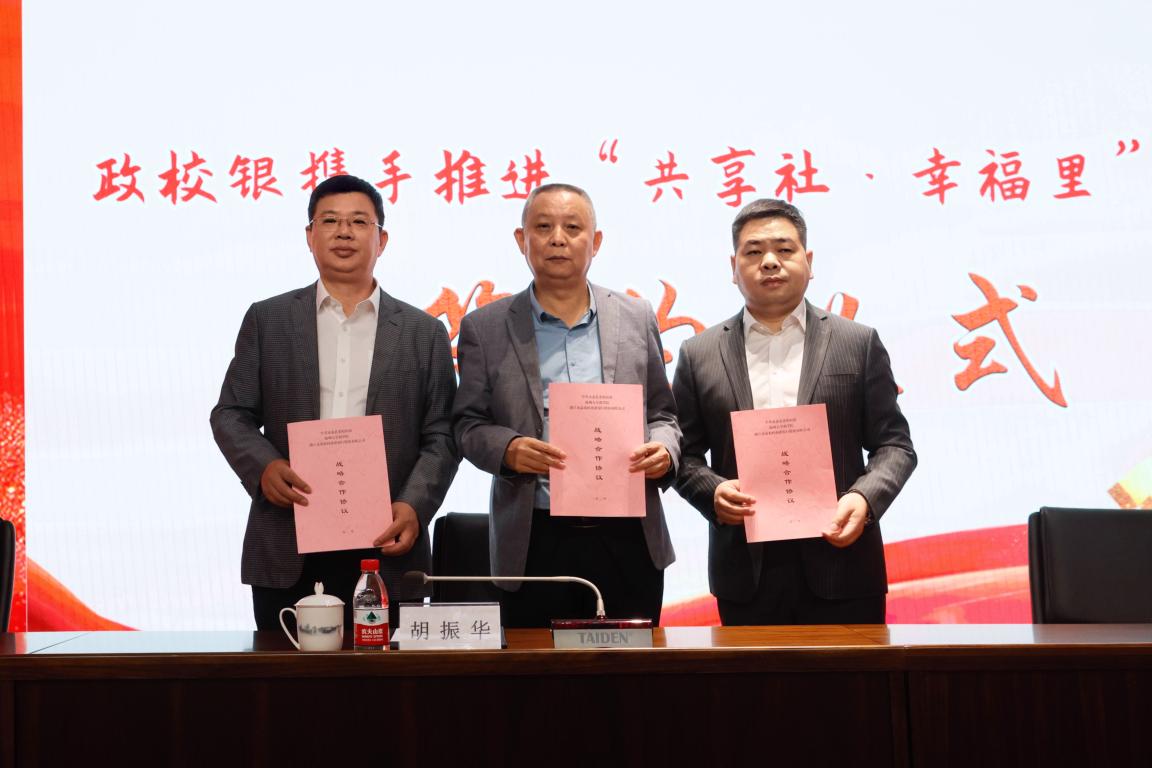 院长胡振华签订三方战略合作协议,并为大学生“共享社·幸福里”项目实践基地进行揭牌仪式。