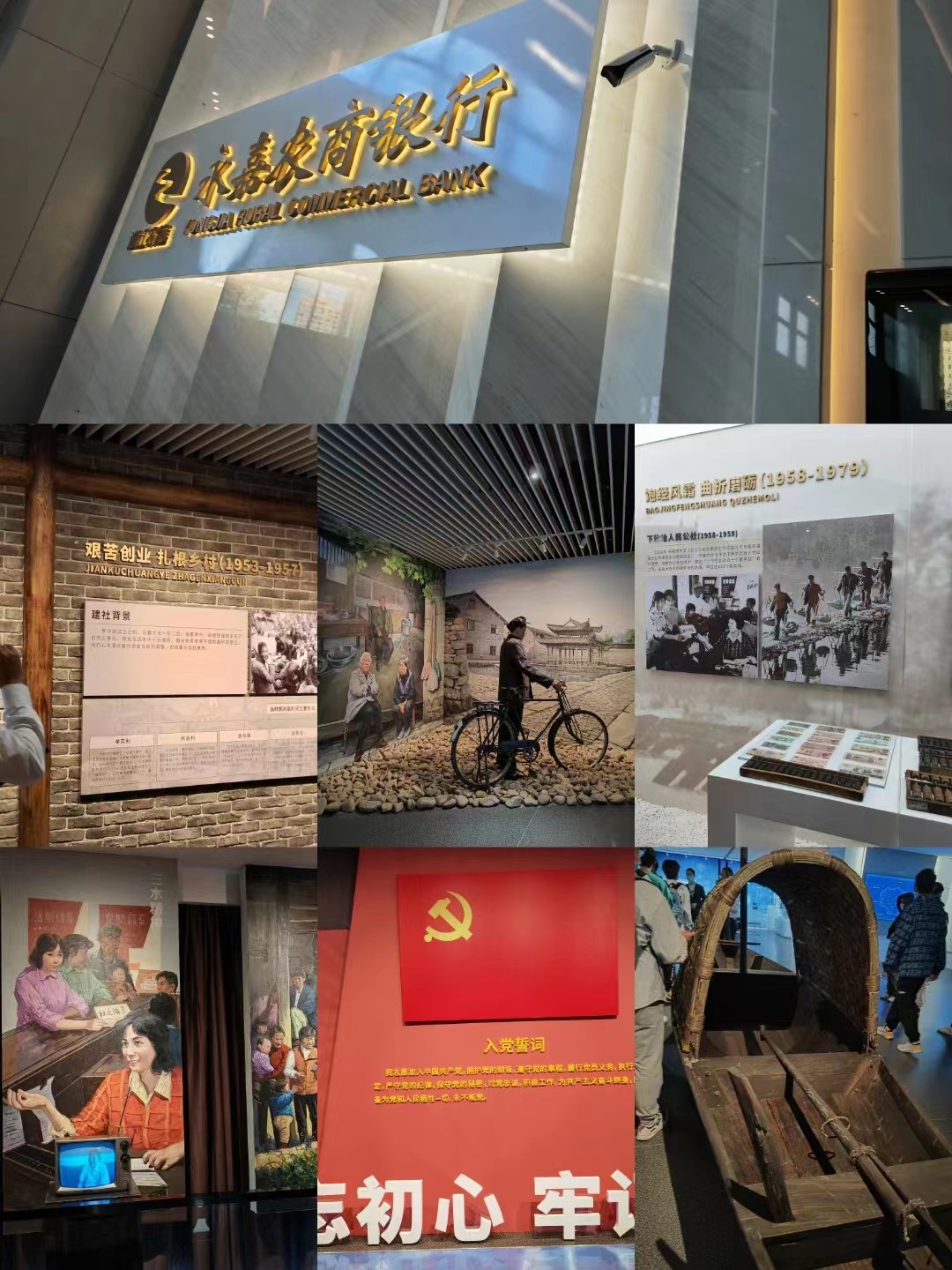 在这里我们看到了十几年前前辈金融人吃住在农户家里办理贷款的票据,骑自行车、坐木船去去解决农民金融贷款问题。墙上展示柱上写有“养猪贷”,“弹棉花贷”、“路费贷”等贴近群众生产生活的各种贷款项目,通过贴近人民生活的灵活便利的贷款,让农民没有后顾之忧、远离高利贷和非法集资。这些金融产品不仅是对日后学习金融贷款创新产品的借鉴,更是金融助力“三农”服务的精准定位。