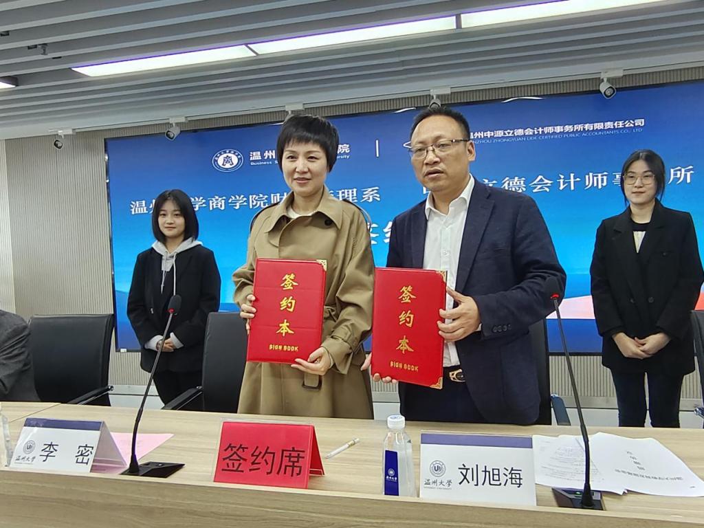 财务管理系与中源立德会计师事务所合作签约仪式暨刘旭海校友会计职规讲座在仲辉商道讲堂顺利举行。学院党委书记李密、中源立德会计师事务所董事长刘旭海、书记夏显光、主任陈秀淼、主任傅玮出席大会,财务管理系各位老师及20财务管理系全体学生也参加了此次讲座,一同交流学习。