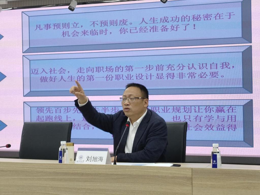 紧接着,刘旭海董事长为20财务管理系全体学生带来精彩讲座。刘董事长从财务人耳熟能详的“资产负债表”切入,围绕如何选择会计方向、如何提升自己的能力等问题,详解会计职业定位及发展规划。他指出,学生应注重提升整体专业素养,以便更好地实现自身价值。