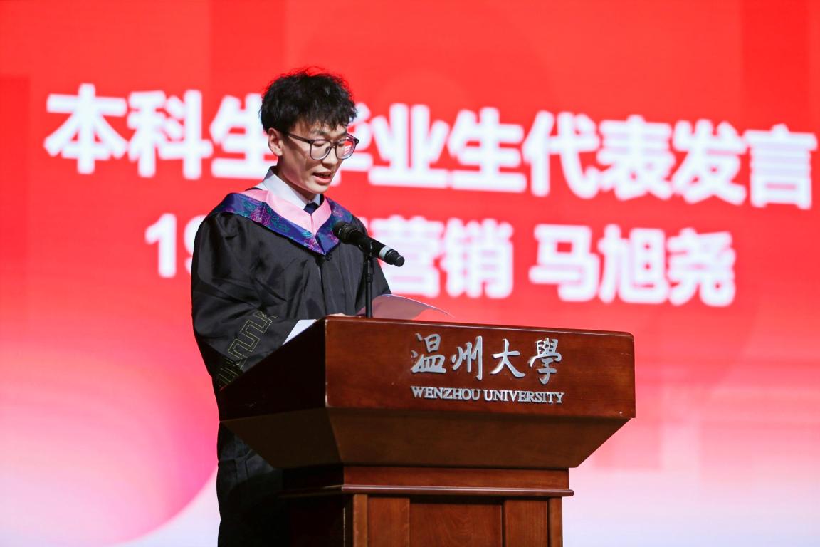 原团委学生会主席、19市销班马旭尧同学作为本科生毕业生代表发言,他回顾了当年报考温州大学的心路历程和在彩票平台