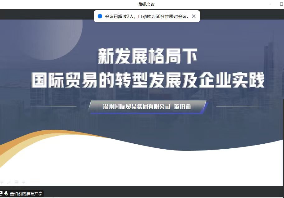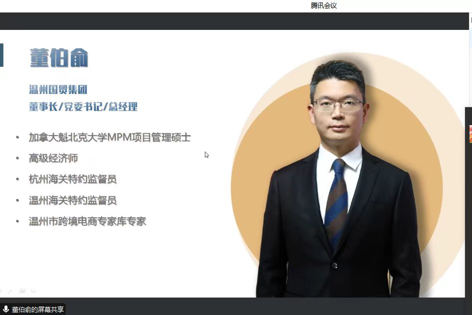 国贸系于2023年6月19日下午邀请温州国贸集团的董事长董伯俞先生,为22级国贸本科同学开展主题为“新发展格局下国际贸易的转型发展及企业实践”的专题讲座。本次讲座虽然是以腾讯会议线上的方式进行,但同学们按时热情参加、认真学习和记录,使本场讲座得到圆满成功。