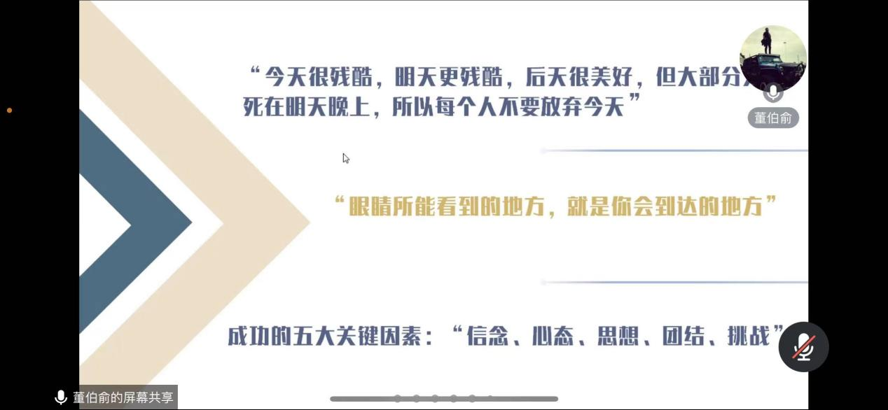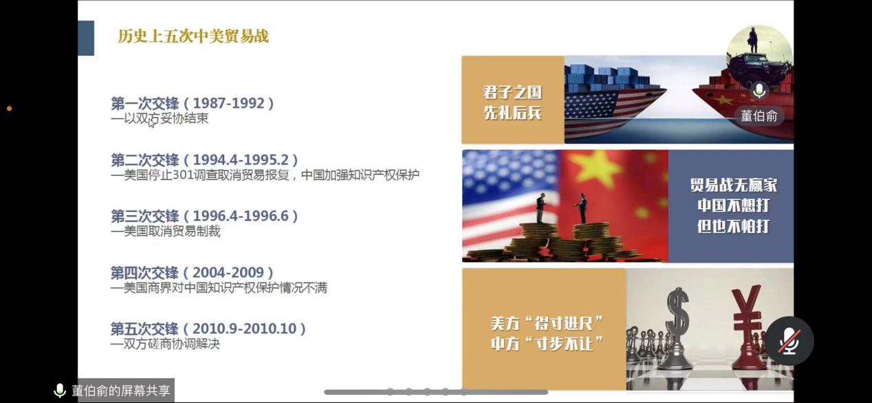首先,董总向同学们介绍了国际贸易发展的总体时间轴。自80年代到现阶段,外贸从被动发展到百家争鸣式绽放。董总介绍了现阶段外贸的大环境,从汇改、税率调整等方面引出当今世界中国外贸情况并不乐观。其次,董总介绍了历史上的五次中美贸易战,向同学们传达“中国不想打,但也不怕打”的思想理念。再次,董总还介绍了外贸的新常态。随着外贸的发展,外贸电商实现了从信息撮合到交易支付,再到综合服务的巨大跨越。董总还提出了“四个不再”,并对此展开详细介绍,加深了同学们对当今世界外贸的认识。最后,董总借成功的五大关键因素来提出对同学们的期许,希望同学们具备信念、心态、思想、团结、挑战这五个成功关键要素。董总说:“眼睛所能看见的地方,就是你会到达的地方!”这句话更是引起了同学们的共鸣,讲座在同学们的热烈反响中结束。