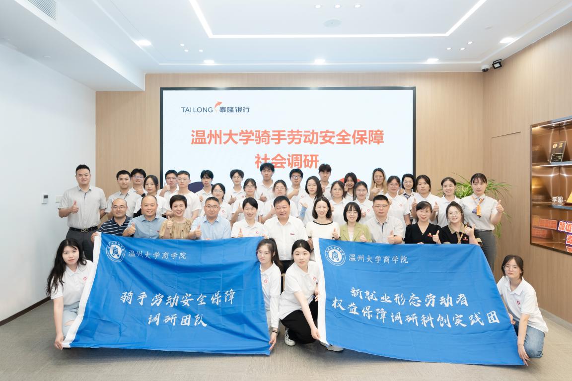 7月13日上午,温州大学校长赵敏、团委书记易招娣、研工部部长高红星、党校办信息科科长郑兆钧、团委学生科技创新指导中心主任张淑娴一行赴泰隆商业银行五马支行慰问我院新就业形态劳动者权益保障调研科创实践团,泰隆银行温州分行副行长蒋丽英、泰隆银行温州五马支行行长章策、泰隆银行温州分行人力资源部总经理陈贞纯、泰隆银行温州分行综合办公室主任工会主席卢劭炜,鹿城团区委书记李璐颖、鹿城团区委办公室负责人谢思倩,温州大学彩票平台