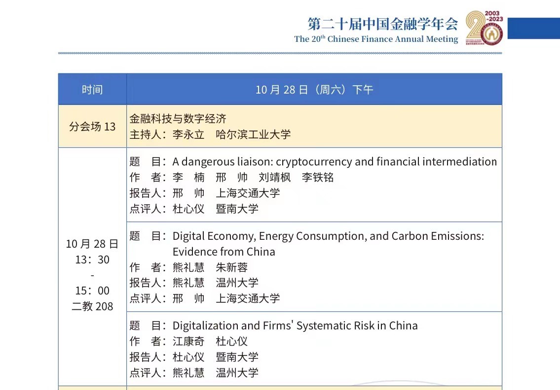 2023年10月28日至10月29日,由中央财经大学和中国金融学年会理事会联合主办、中央财经大学金融学院承办、嘉实基金管理有限公司、北京聚源锐思数据科技有限公司和WRDS沃顿数据平台共同支持的第二十届中国金融学年会在北京顺利召开。本届年会秉承中国金融学年会的一贯宗旨,搭建立足中国、面向世界的开放互动交流平台,汇聚国内外金融学届同仁,围绕中国金融发展中的重大问题、共聚共研,积极推进中国金融领域的前沿研究,推高中国学术研究在世界范围内的声誉和地位。