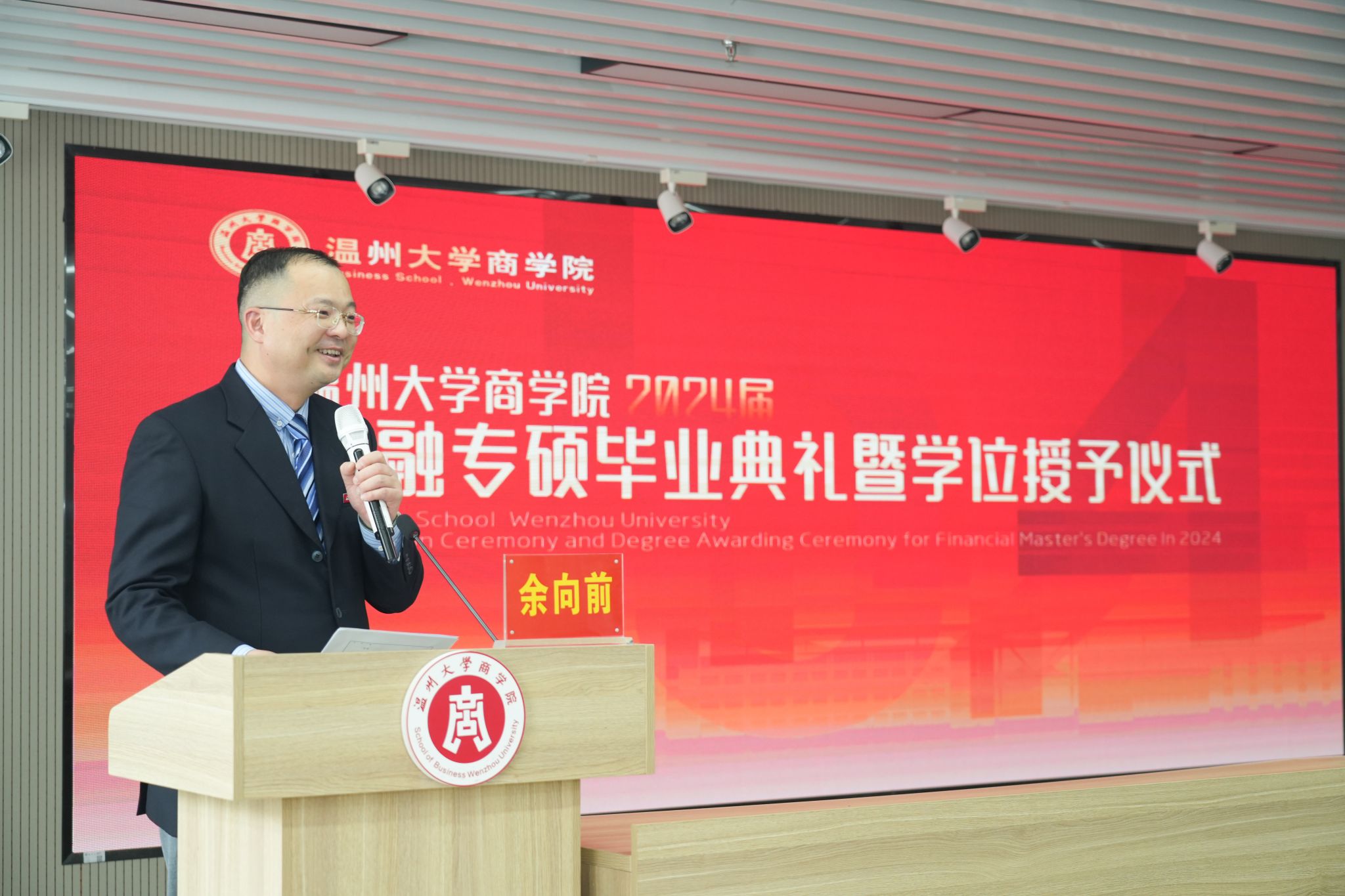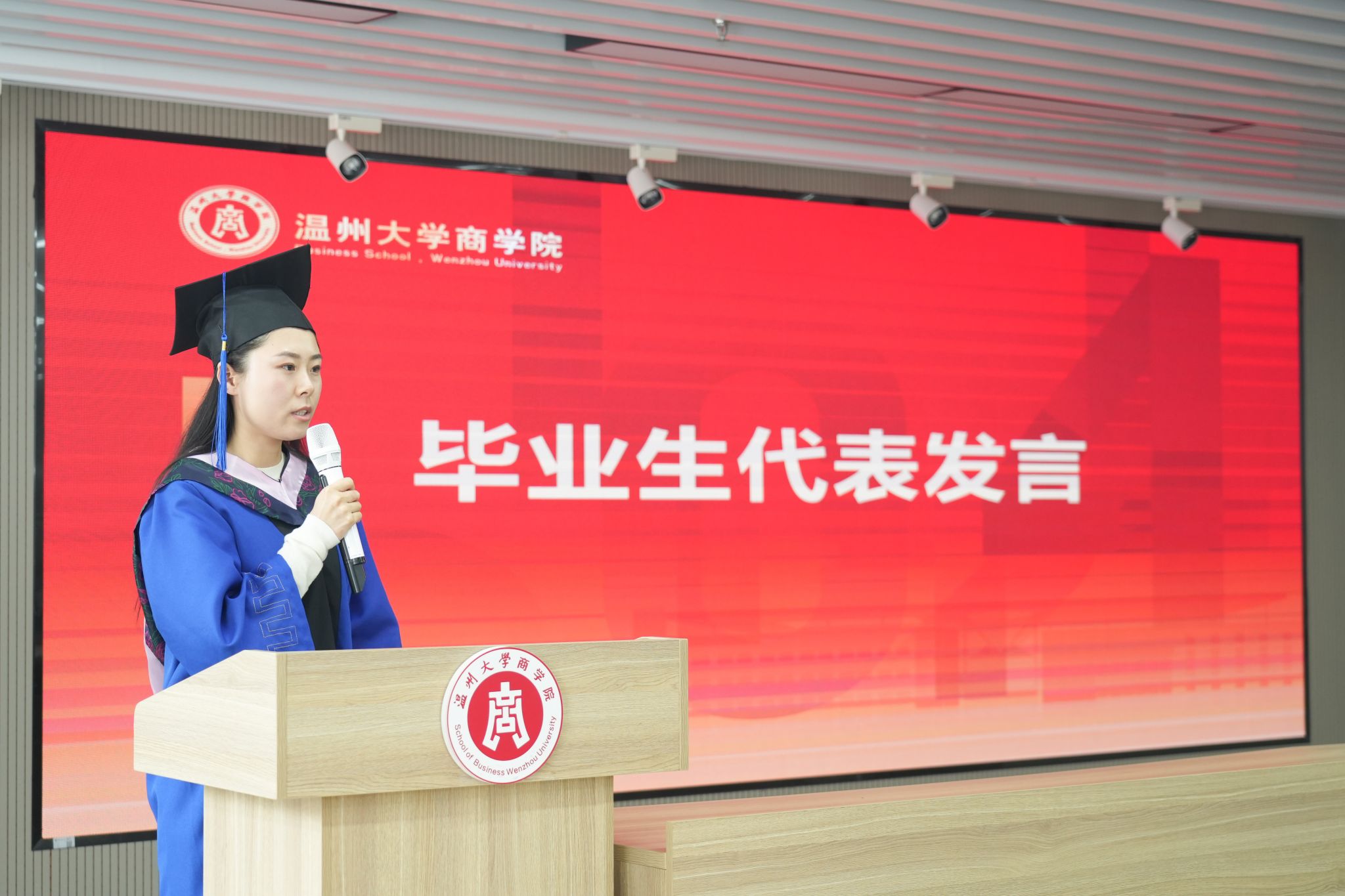 21级金融专硕刘志迎同学作为毕业生代表发言。她感谢温州大学提供的优越求知平台和学习环境,免费开放大量的讲座和优秀的公开课,还有大师级别的老师传道授业解惑。老师们深入浅出的讲解,让学生们更加深刻的理解学术的精髓,同时学院还聘任行业大佬担任同学们的校外导师,为学生提供实习机会,分享行业经验。最后,她再次感谢学院老师们这两年多的悉心教导和精心栽培,感谢同学们给予的陪伴和支持。在未来的日子里,她祝愿各位老师硕果累累,桃李芬芬,祝愿温大蒸蒸日上,祝愿同学们前程似锦。