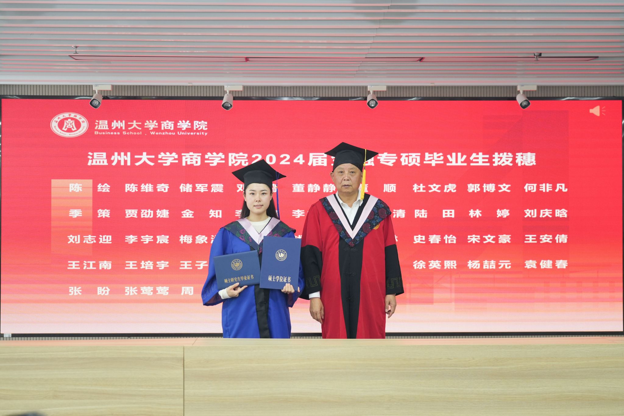 拨穗象征着成熟,代表着毕业生们硕果累累、学有所成。胡振华院长为每一位毕业生颁发毕业证书、学位证书、拨穗,并合影留念。