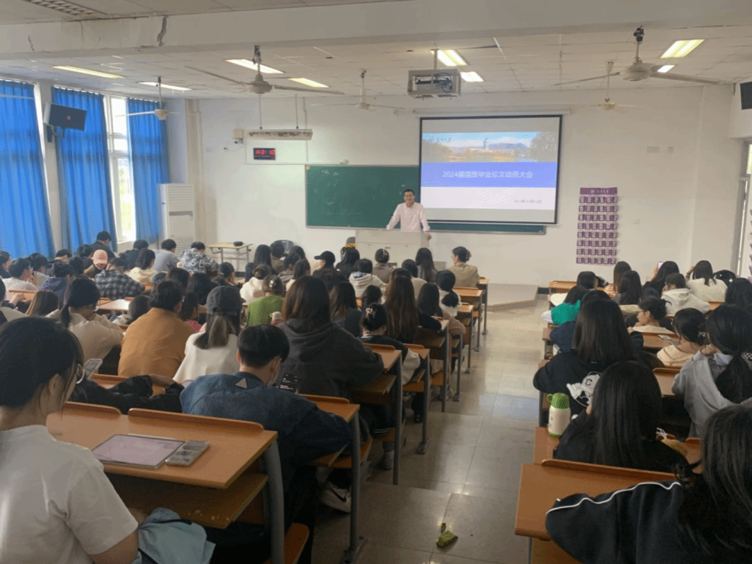 国贸系2024届毕业论文动员大会在北2-402教室顺利召开。本次动员大会由国贸系姜亮老师主持,国贸系各位老师、国贸本科和国贸专升本毕业班级的学生参加了本次大会。