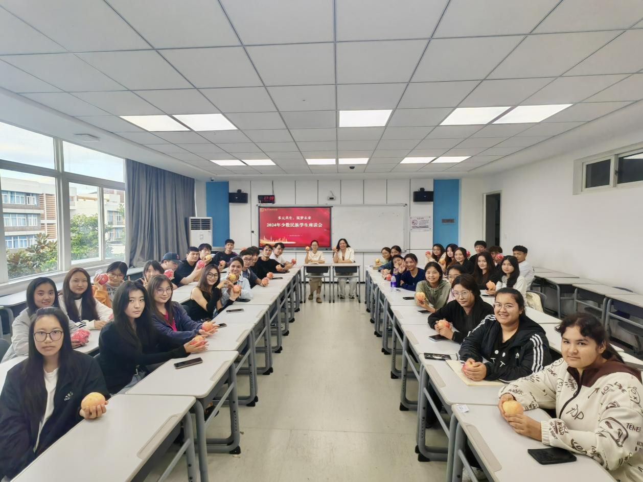一直以来对少数民族学生的关怀和支持。曾蓓蕾副书记提到,9月27日在北京举行的全国民族团结进步表彰大会上,习近平总书记强调,要全面贯彻新时代中国特色社会主义思想特别是党关于加强和改进民族工作的重要思想,坚持以铸牢中华民族共同体意识为主线,不断推进民族团结进步事业。曾书记强调了加强中华民族共同体意识的重要性,希望同学们能够树立远大理想,坚定信念,努力拼搏,成为促进民族团结、传承中华文化、推动社会进步的积极力量。为实现中华民族伟大复兴的中国梦贡献自己的青春力量。