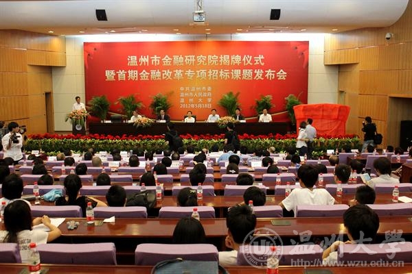 5月18日,由我院作为主要力量筹建的温州市金融研究院、温州大学金融研究院、温州大学金融学院挂牌成立。副省长、温州市委书记陈德荣,市委常委、秘书长葛益平,副市长朱忠明,校党委书记陈福生,我校兼职教授、研究院院长谢平等出席会议并讲话。揭牌仪式由蔡袁强校长主持。