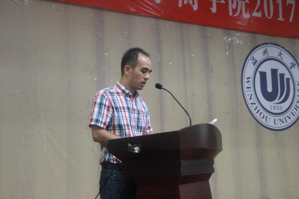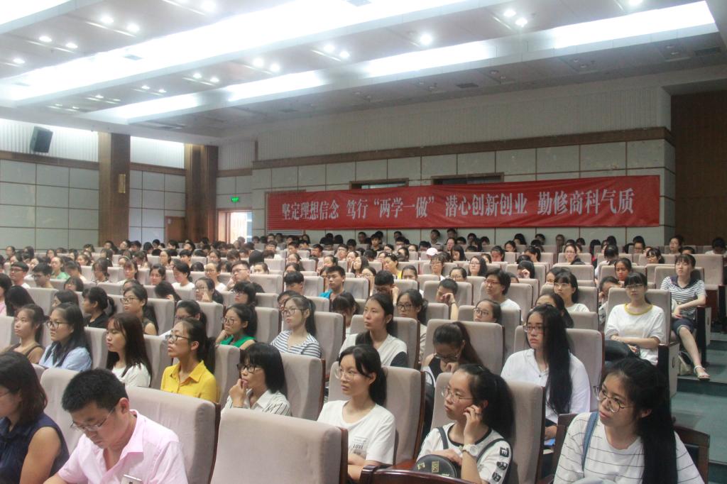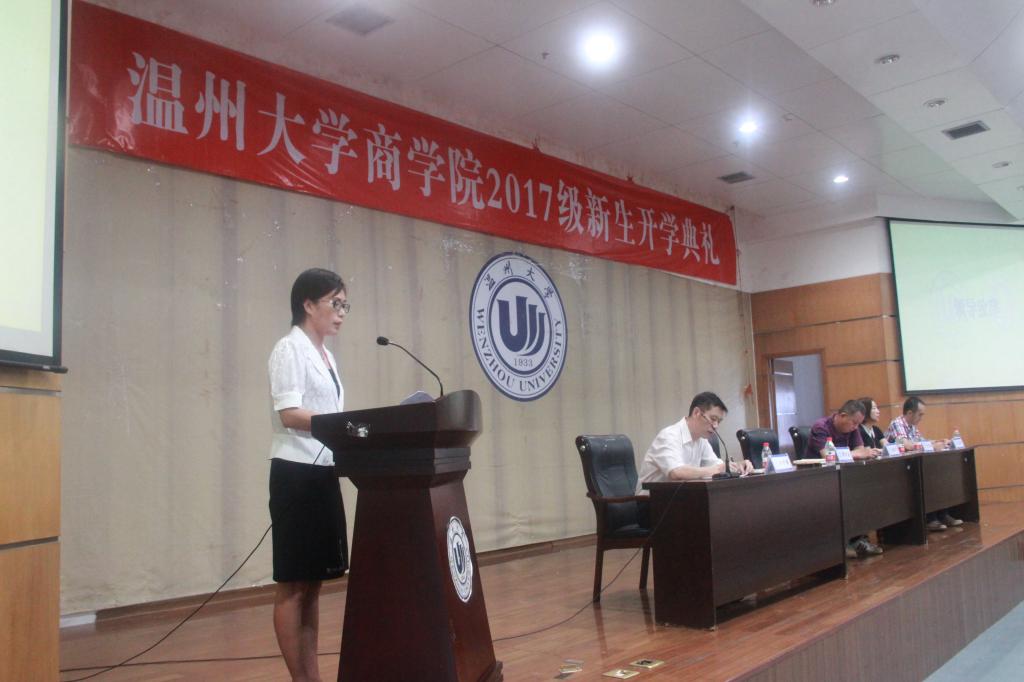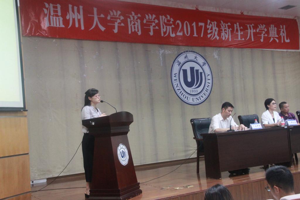 2017级新生开学典礼的帷幕。郑彩莲书记在致辞中代表学院向17级新生的到来表示衷心的祝贺和诚挚的欢迎。郑书记围绕“概率与你”的主题,向新生提出“提高大学期间成才的概率、提高大学期间善于交往的概率、提高大学期间强身健体的概率、提高大学期间自我保护的概率”四方面的期望。她以17届优秀毕业生13金融工程班的朱圆缘同学为例,鼓励新生多与牛人交往,她认为交往是一种能力,善于交往更是一种智慧,要在交往中提升自己的格局;郑书记还以我院优秀校友王仲辉先生为例,建议新生及时明确目标,并付诸行动坚定前行。