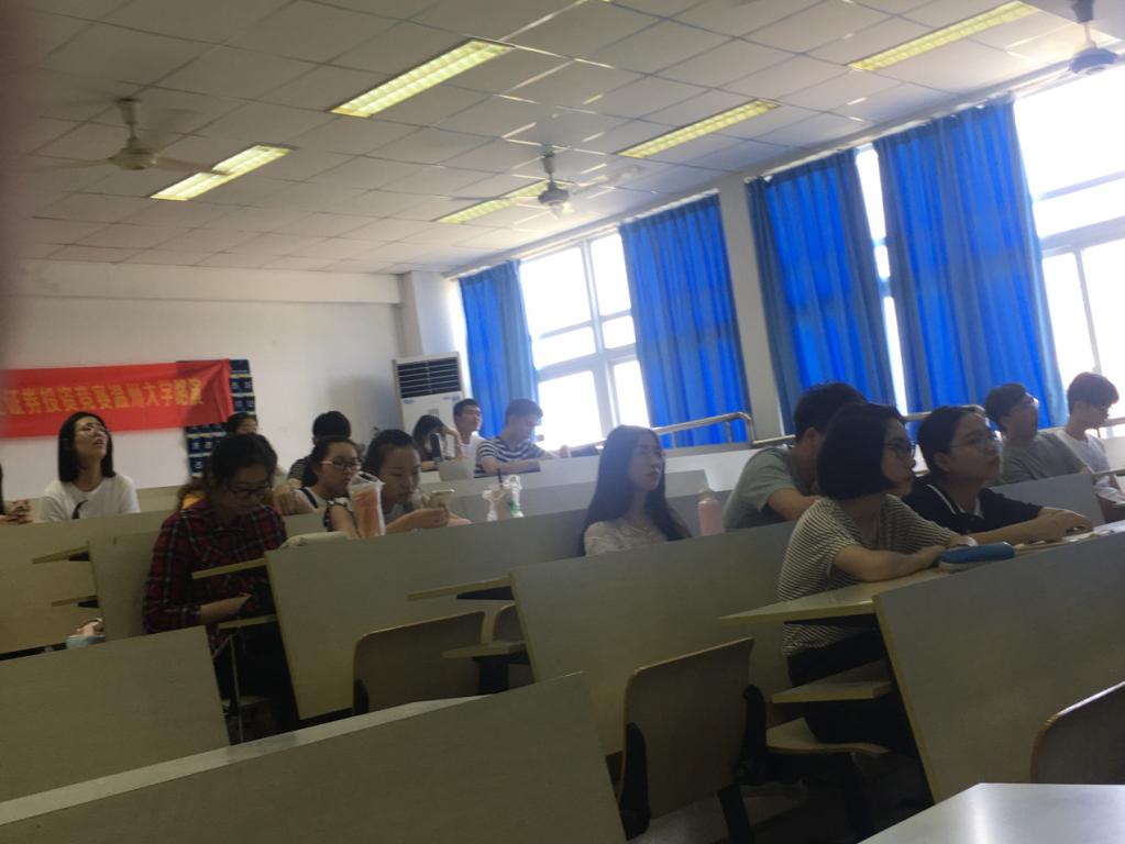 为了更好地让各温州大学的学生了解今年大赛及取得更好成绩,2018年5月16日,浙江省大学生证券投资委员会派出以同花顺饶龙朋为领队、同花顺马特、东北证券陈玉玺、柯景挺等为成员的专家组来我校进行专场讲座,讲座于13点30分在北校区3号楼402教室进行,参加比赛的部分同学前来听讲。