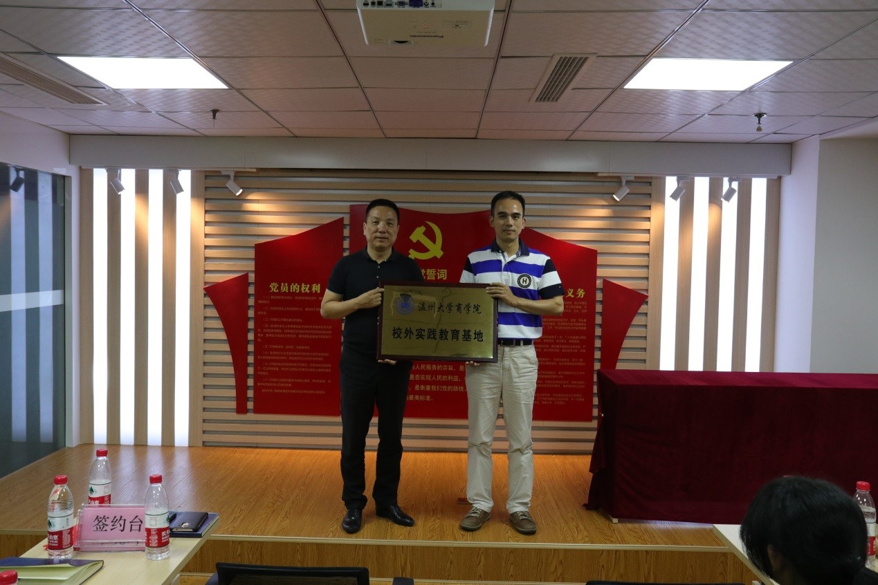然后,举行了实践基地的签约仪式。罗建利副院长与陈晓晖董事长分别代表温大彩票平台