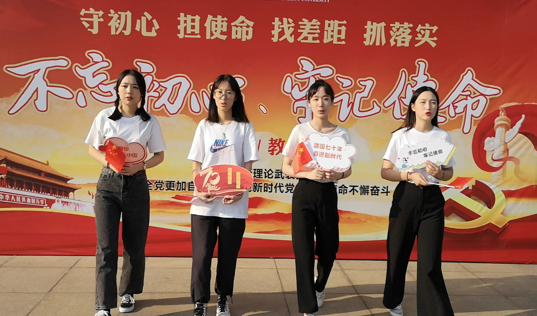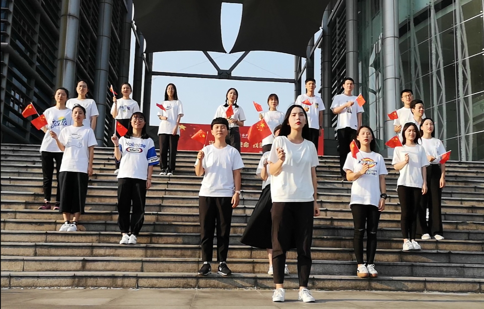 首先,在学生会的协助下,各位党员了解了拍摄主题视频的走位情况。接着,党员们手持着小红旗以及印有“建国七十年 奋进新时代” “我爱你中国”“不忘初心 牢记使命”等字样的宣传牌,由三位女生从商院楼里走出来,四位女生从“不忘初心,牢记使命”主题教育的宣传牌前走出来,再由三位男生从宣传牌另一侧走出来,剩下的党员则在台阶上斜着站成一排,大家开始齐声歌唱《我和我的祖国》。最后,全体党员围成一个爱心的形状,手中挥舞着小红旗,热情澎湃地唱着献给祖国的赞歌。