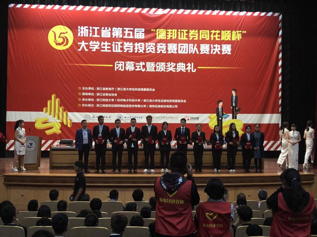 2019年10月26日,我院学子前往杭州参加浙江省第五届“德邦证券同花顺杯”大学生证券投资竞赛团队赛决赛答辩。在与全省多所高校的激烈角逐中,我院学子最终创下了一等奖1项、二等奖8项、三等奖2项的历史佳绩。