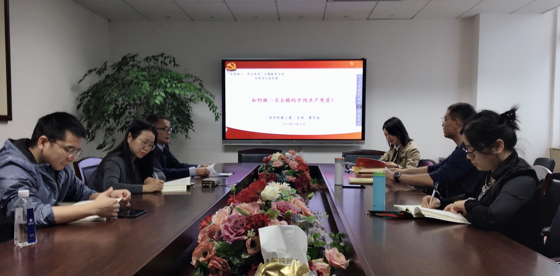 教工第三支部(市销系)书记龚军姣老师召集支部会议。不仅向大家传达她多日培训进修的会议精神,而且根据“不忘初心,牢记使命”主题教育学习活动的安排,特意为我们支部准备了一场“如何做一名合格的中国共产党员”专题报告,支部成员围绕着“乐于自我奉献、勇于坚定信念、敢于自我革命”三个层面进行了学习和探讨,对做一名合格的中国共产党员,有了更深刻的理解——以人民为中心,始终把人民利益放在第一位。