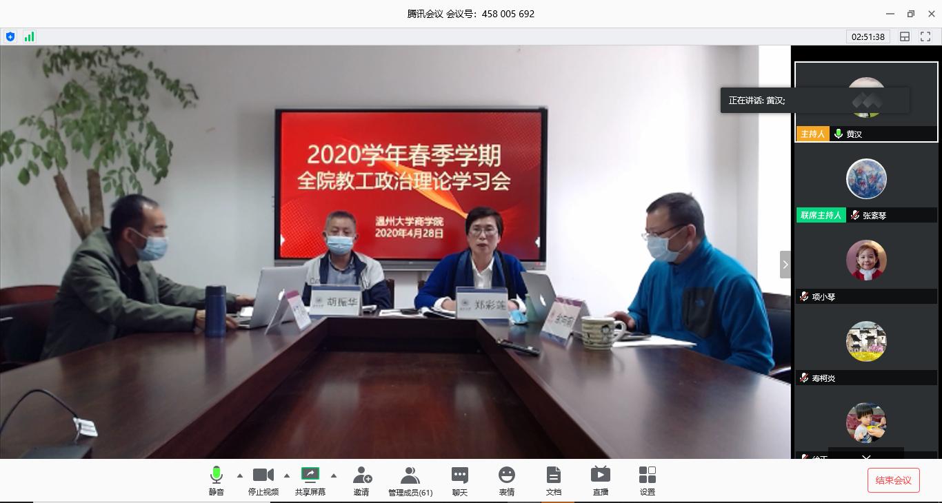 郑彩莲书记最后强调,各位老师务必要在思想上高度重视返校工作,这是目前重中之重、当务之急的工作,做好“外防输入,内防反弹”工作;每位老师都要自觉扛起肩上的责任和担当,尤其在数据填报工作中,坚持不瞒报、漏报、错报,不信谣,不传谣;在学生返校后,要全面做好教学、考试与管理工作,学院也将做好顶层设计、科学决策,希望在所有师生的努力下平稳、安全地完成开学返校工作。