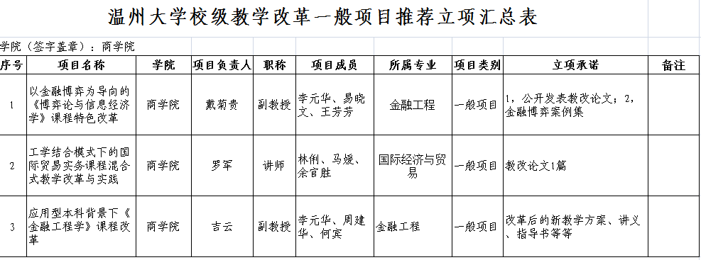 根据《温州大学课堂教学创新行动计划》(温大行政〔2014〕269号)的文件精神,我院组织开展了2017年校级教学改革项目立项评审工作。经学院专家评审同意《以金融博弈为导向的《博弈论与信息经济学》课程特色改革》等3项立项为一般项目、《创新创业教育与专业能力培养深度融合 ——市场营销专业人才培养体系改革》推荐参与学校重点项目评审,现将结果予以公示(具体名单详见附件)。公示时间从即日起至9月29日,如有老师对结果有异议,请与教学科徐老师联系,联系电话:86680957。