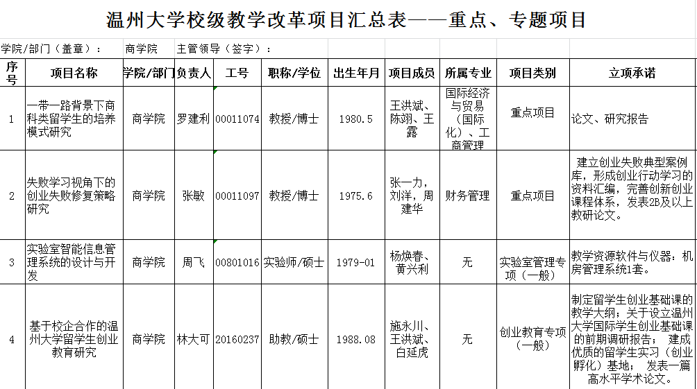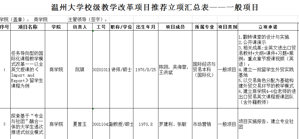根据《温州大学课堂教学创新行动计划》(温大行政〔2014〕269号)的文件精神,我院组织开展了2018年校级教学改革项目立项评审工作。经学院专家评审同意《任务导向型的国际化课程教学模式改革——以全英文授课的《Import and Export》留学生课程为例》等2项推荐立项为一般项目、《一带一路背景下商科类留学生的培养模式研究》等4项推荐参与学校重点项目及专项项目的评审,现将具体名单予以公示,公示时间为三天(4月10日-4月12日),如有老师对结果有异议,请与教学科徐老师联系,联系电话86680957。