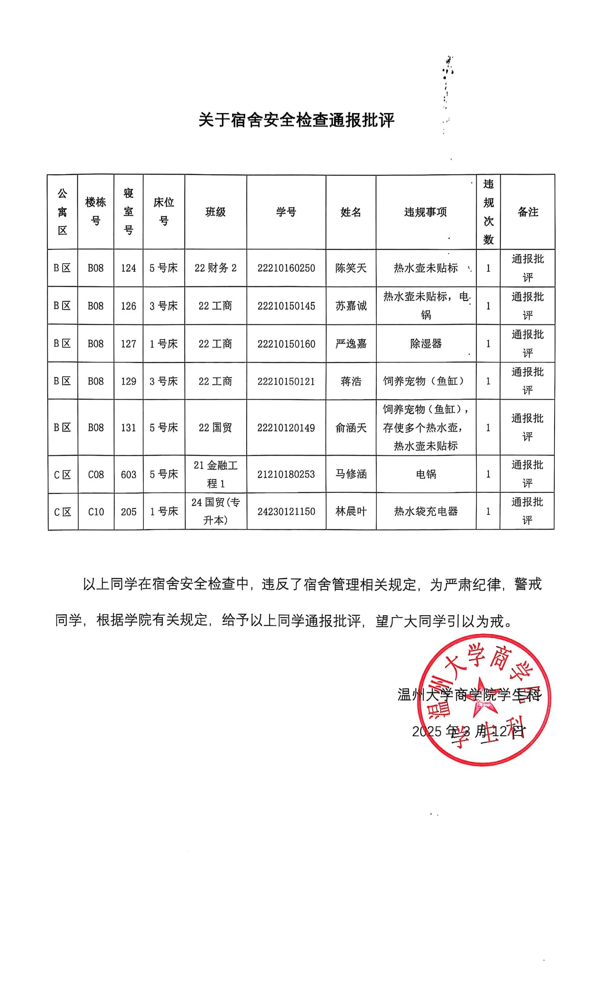 根据学校学生公寓安全“四级联查”工作机制要求,学工部、研工部、公管处、保卫部、资产公司等部门协同于3月6日对学生公寓区安全情况进行检查,我院以下同学在宿舍安全检查中,违反了宿舍管理相关规定,给予通报批评处分,通报如下: